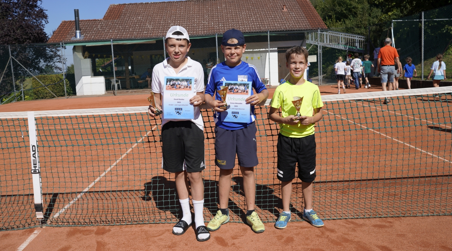 Für die jüngsten Jahrgänge wurde eine Tennisolympiade durchgeführt, bei der die Kinder vier Stationen durchliefen und auf Punktejagd waren. Dabei wurden die Kinder an jeder Station von einem ehrenamtlichen Betreuer unterstützt. Für die beiden älteren Jahrgänge standen Einzelbegegnungen auf dem Plan. Jeder gegen jeden spielte je einen Matchtiebreak aus, wobei sich nach besonderer Wertung sehr knappe Turnierergebnisse einstellten. Turniersieger wurde der Spieler (oder die Spielerin) mit den meisten gewonnenen Spielen. Alle Partien wurden von vereinsinternen Oberschiedsrichtern begleitet .Die Vereinsmeister 2025 in den jeweiligen Altersklassen sind: David Duleba, Simon Metzelthin und Valentin Blasi. Alle drei erhielten je einen Pokal. Allen Teilnehmern wurden eine Urkunde und ein Trainingsshirt als Anerkennung für ihre Leistungen und die Begeisterung am Tennissport verliehen. Dabei galt auch ein großer Dank Uli Sager und Sebastian Eibelsgruber für die Spende der T-Shirts. Drei weitere Kinder konnten beim Tennisquiz punkten und freuten sich über einen Kinogutschein. Aufgrund der Betreuung durch einen Trainer und die ehrenamtlichen Helfer am Tennisplatz während des Trainings und im Turnier, der engagierten Mithilfe der Eltern bei der Verpflegung der Kinder sowie der Unterstützung und das Anfeuern konnte das Wochenende so gut gelingen.